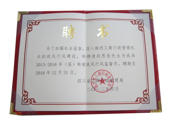 5月,為加強(qiáng)社會(huì)監(jiān)督,推進(jìn)全省工商行政管理系統(tǒng)的政風(fēng)行風(fēng)建設(shè),四川省工商行政管理局聘請(qǐng)了2013-2016年(屆)特邀政風(fēng)行風(fēng)監(jiān)督員,集團(tuán)趙董事長(zhǎng)作為企業(yè)家代表也獲邀請(qǐng)。此次特邀的監(jiān)督員包括省政協(xié)委員、省直機(jī)關(guān)工委巡視員李成林;省政協(xié)委員、省政法委巡視員賈月成等14位來(lái)自省內(nèi)政界、商界、媒體的代表。特邀監(jiān)督員人選由省級(jí)工商局請(qǐng)政府糾風(fēng)工作主管部門推薦,經(jīng)征求本人意見后正式聘請(qǐng)并頒發(fā)聘書和證件。